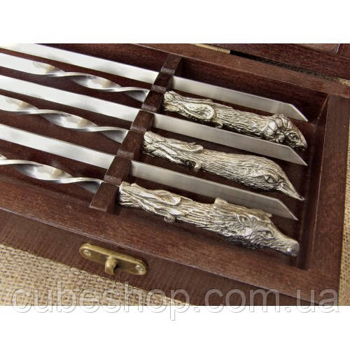 Подарунковий набір шампурів з бронзовими литими ручками. Поставляється в кейсі з натурального дерева.