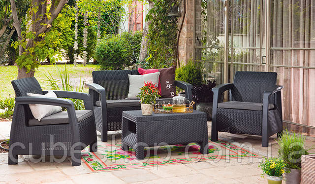 Брак металевих деталей гарантує брак іржі та довговічність. Меблі компанії Keter виготовлені з міцного атмосферостійкого пластику, який імітує ротанг.